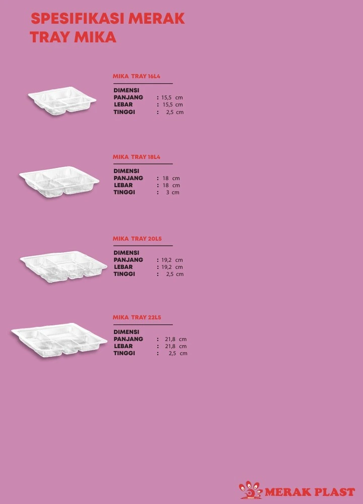 | 4 | Mika Tray 22L5 | 21,8 cm x 21,8 cm x 2,5 cm | Tray mika besar, cocok untuk makanan utama atau catering |
